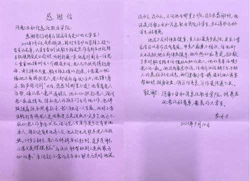 2025年8月16日深夜,人工智能学院移通23-1班学生李树政在回家途中,于焦作高新区世纪路与凯旋路交叉口偶遇一位摔倒无法起身的老人。他没有犹豫,果断上前施以援手,开启了一场温暖的深夜守护,最终将老人安全送回家中。近日,老人家属的感谢信送达学院,这段暖心事迹才被众人知晓。