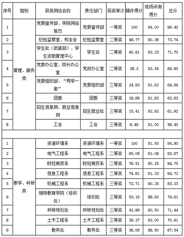 为进一步提升我院校内网站的建设水平,改进和提高校内网站服务质量,根据《河南工业和信息化职业学院关于开展校内网站评比活动的通知》安排,我院于10月25日—12月1日举行了2016年校内网站建设评比活动。评比中,依据网站性质将责任部门分成管理、服务类(13个)和教学、科研类(15个)两组,结合校园网首页及各部门网站发稿数量,在自评互评的基础上,抽调专人组成评审委员会,按照《河南工业和信息化职业学院校内网站评分指标》对各部门网站建设情况进行了现场评测。现将评比结果公布如下: