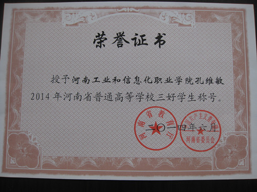 在2014年河南省普通高等学校三好学生、优秀学生干部和先进班集体评选活动中,我院严格按照《河南省教育厅共青团河南省委员会关于评选表彰2014年河南省普通高等学校三好学生、优秀学生干部和先进班集体的通知》(教学〔2014〕135号)要求,经各系初评、学院公示和推荐,河南省教育厅、共青团河南省委员会评审,我院建筑工程系学生孔维敏荣获“2014年河南省普通高等学校三好学生”荣誉称号。