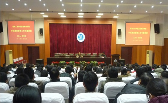 2013年12月17日下午,学院全体教职工在多媒体报告厅共同聆听了“学生教育管理工作专题讲座”,讲座由学生处刘士合处长主持,河南省高等学校优秀辅导员、焦作师范高等专科学校黄爱菊老师主讲。