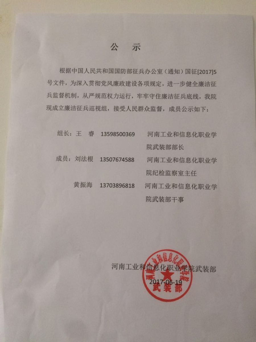 2017年6月19日,河南工业和信息化职业学院成立廉洁征兵巡视组,现已公示,欢迎监督。
