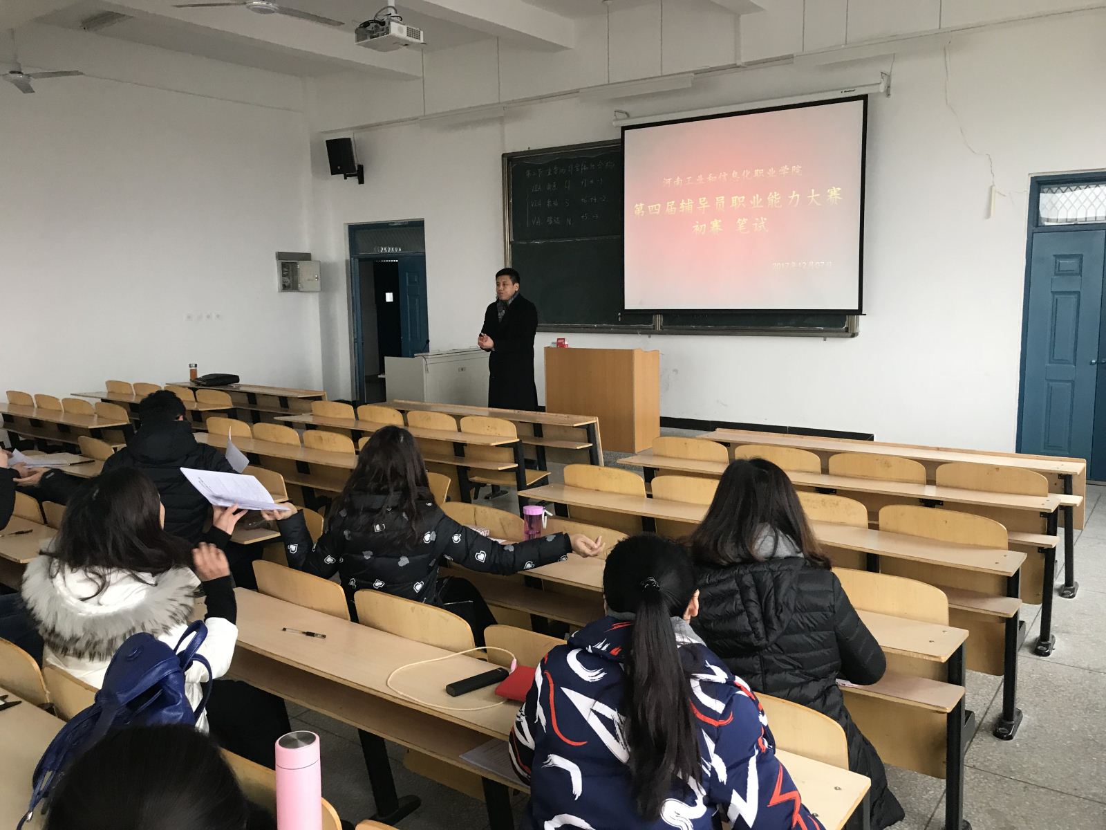 为加强我院辅导员队伍建设,推进辅导员专业化、职业化发展,引导广大辅导员坚定职业理想、明确职业目标、提升职业能力、实现职业价值,进一步加强高校辅导员队伍专业化、职业化建设,提升大学生思想政治教育质量,决定于12月全面启动了第四届辅导员职业能力大赛,并于12月14日下午在2号教学组团2205教室进行笔试环节,我院全体辅导员参加考试。