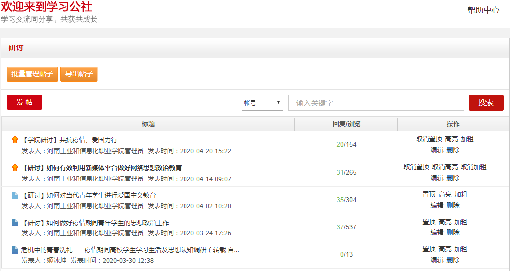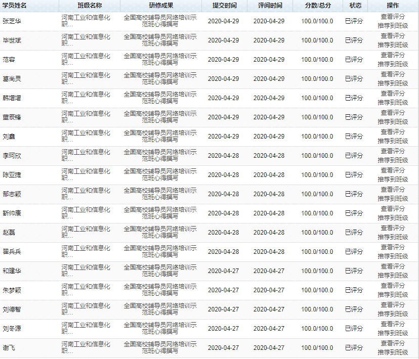 培训过程中,我院老师认真学习了“价值引领与思想引导”、“职业生涯规划与就业指导”、“学业指导与班级管理”、“心理调适与健康维护”、“日常事务教育管理”、“疫情防控知识”六大模块的内容同时,全体学员认真参加了《疫情防控治理效能与中国制度优势》、《疫情期间如何缓解学业和毕业焦虑》、《疫情防控下如何利用网络开展大学生思想政治工作》、《疫情防控下如何做好大学生就业指导工作》四次直播答疑活动,并就相关主题进行了研讨活动。最后,每位学员结合学习和自己的工作实际,提交了一篇不少于1500字的学生思想政治工作案例。2020年4月30日上午9时,全体参训学员参加了本次高校辅导员网络培训班的结业仪式,圆满完成了此次培训工作。