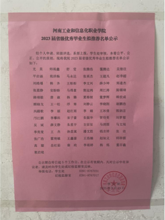 根据《河南省教育厅办公室关于评选2023年河南省普通大中专学校优秀应届毕业生的通知》文件要求,我校开展了2023年优秀应届毕业生评选工作。经个人申请、班级评选、系部上报,学生处审核,本着公平、公正、公开的原则,现已将拟推荐名单公示在二组团教学楼处,同时请各系部在本系部范围内进行公示。