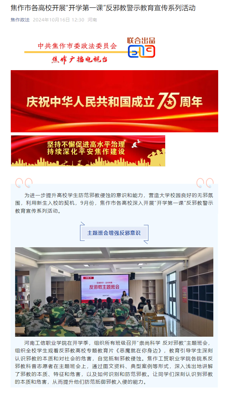 《焦作政法公众号2024-10-16》报道我校开展“开学第一课”反邪教警示教育宣传活动