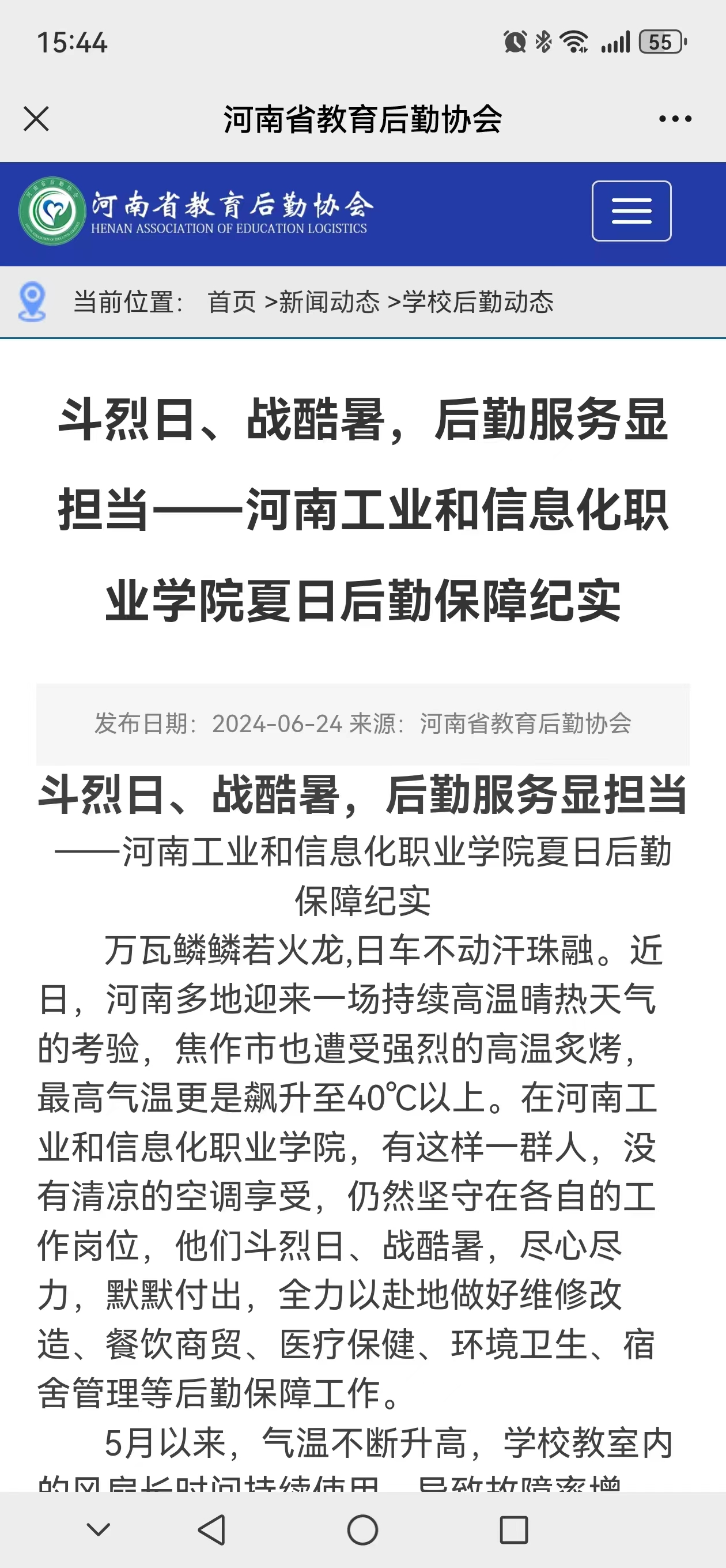 万瓦鳞鳞若火龙,日车不动汗珠融。近日,河南多地迎来一场持续高温晴热天气的考验,焦作市也遭受强烈的高温炙烤,最高气温更是飙升至40℃以上。在河南工业和信息化职业学院,有这样一群人,没有清凉的空调享受,仍然坚守在各自的工作岗位,他们斗烈日、战酷暑,尽心尽力,默默付出,全力以赴地做好维修改造、餐饮商贸、医疗保健、环境卫生、宿舍管理等后勤保障工作。