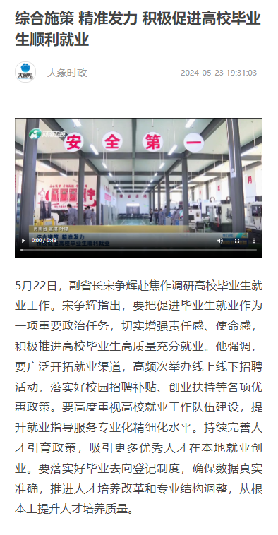 《大象新闻2024-5-23》报道副省长宋争辉到我校调研毕业生就业工作进展情况