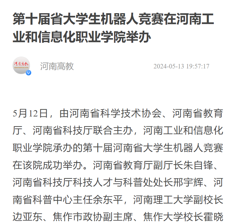5月12日,由河南省科学技术协会、河南省教育厅、河南省科技厅联合主办,河南工业和信息化职业学院承办的第十届河南省大学生机器人竞赛在该院成功举办。河南省教育厅副厅长朱自锋、河南省科技厅科技人才与科普处处长邢宇辉、河南省科普中心主任余东平,河南理工大学副校长边亚东、焦作市政协副主席、焦作大学校长霍晓丽、焦作师范高等专科学校校长相天东、焦作市科协四级调研员李峰、河南工业和信息化职业学院党委书记尹彦礼、院长史先进等领导出席开幕式。