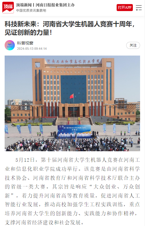 5月12日,第十届河南省大学生机器人竞赛在河南工业和信息化职业学院成功举行。该竞赛是由河南省科学技术协会、河南省教育厅和河南省科学技术厅联合主办的省级一类大赛。其宗旨是响应“大众创业、万众创新”,着力提升河南省高等教育质量,促进河南省人工智能行业发展,推动高校加强学生工程实践训练,重点培养河南省大学生的创新能力、实践能力和协作精神,支撑河南省经济建设和社会发展。