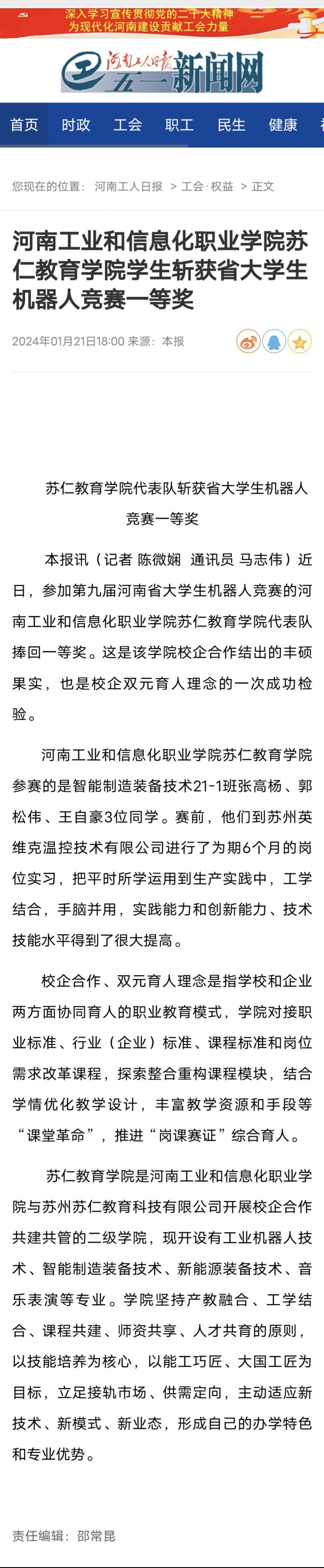 《河南工人日报2024-1-21》报道我校学生获得省大学生机器人竞赛一等奖