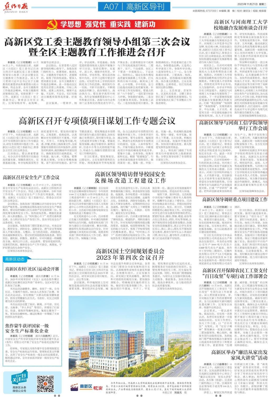 《焦作日报2023-11-21》报道高新区领导与我校领导举行工作会谈
