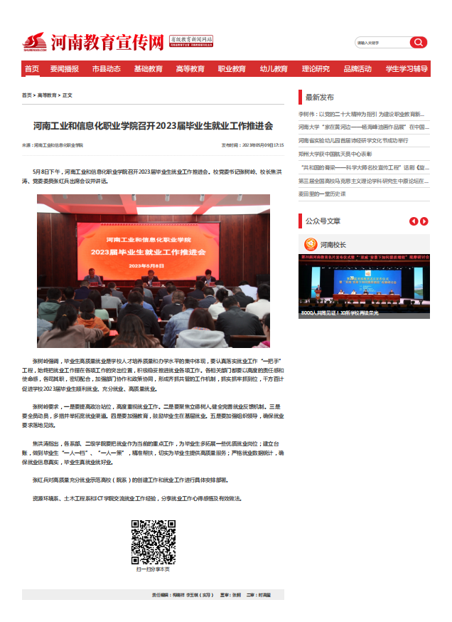 《河南宣传教育网2023-5-9》报道我校召开2023届毕业生就业工作推进会