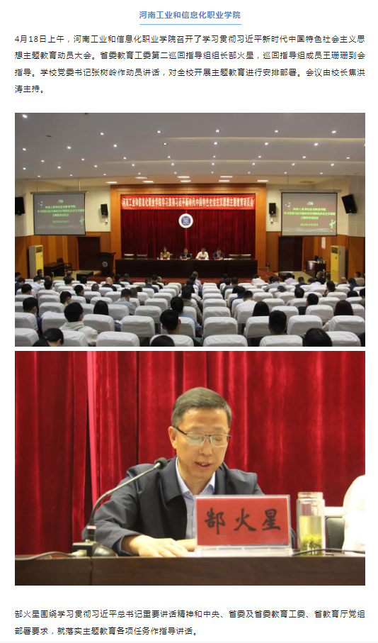 《河南高校2023-4-20》报道我校学习贯彻习近平新时代中国特色社会主义思想主题教育动员会
