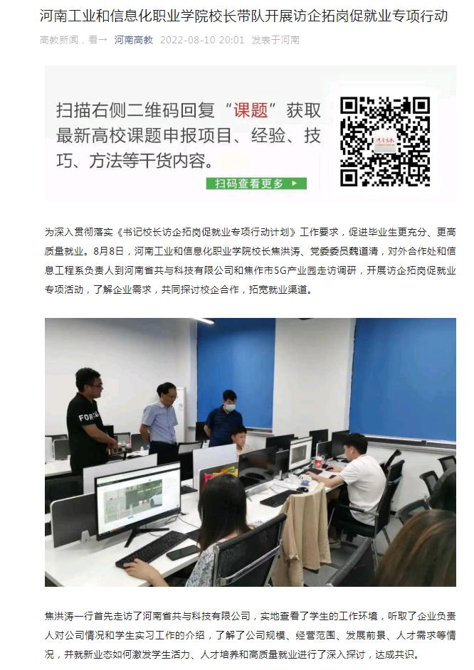 《河南高教2022-8-10》河南工业和信息化职业学院校长带队开展访企拓岗促就业专项行动
