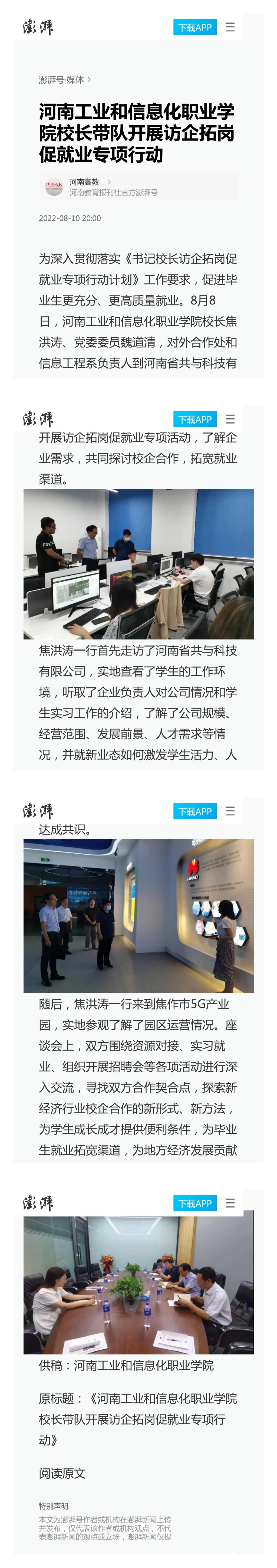 《澎湃新闻2022-8-10》河南工业和信息化职业学院校长带队开展访企拓岗促就业专项行动