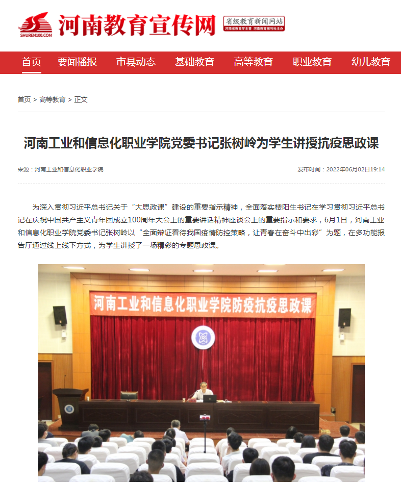 《河南教育宣传网2022-06-02》报道我院党委书记张树岭为学生讲授抗疫思政课