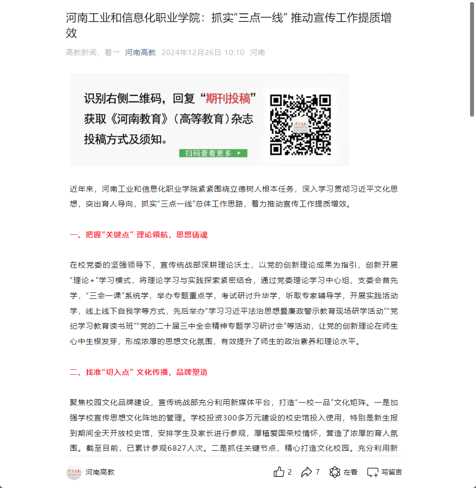 《河南高教 2024-12-26》报道我校抓实“三点一线” 推动宣传工作提质增效