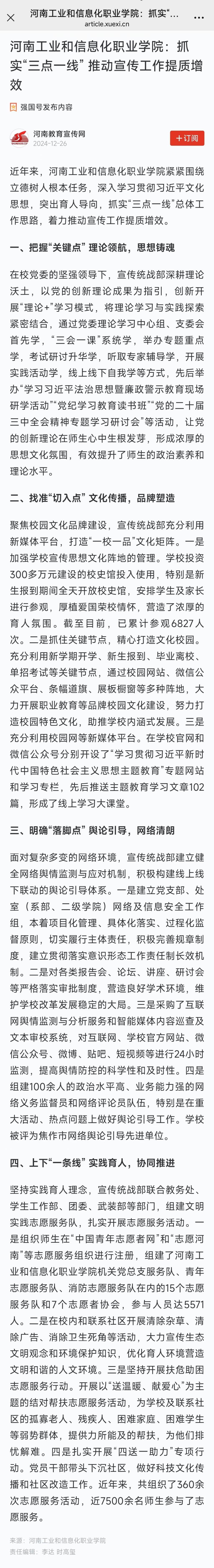 《学习强国 2024-12-26》报道我校抓实“三点一线” 推动宣传工作提质增效