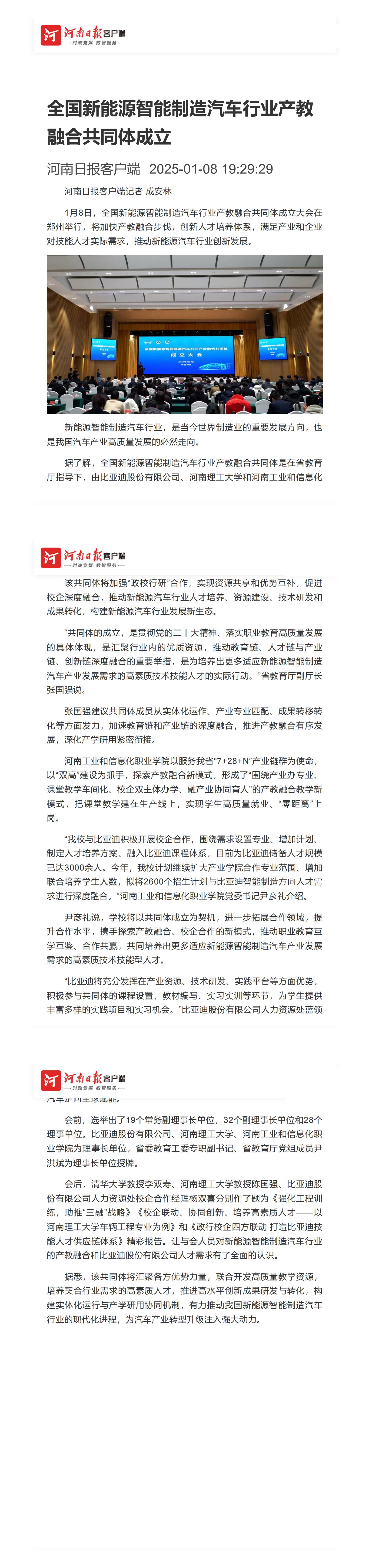 《河南日报 2025-1-08》报道全国新能源智能制造汽车行业产教融合共同体成立