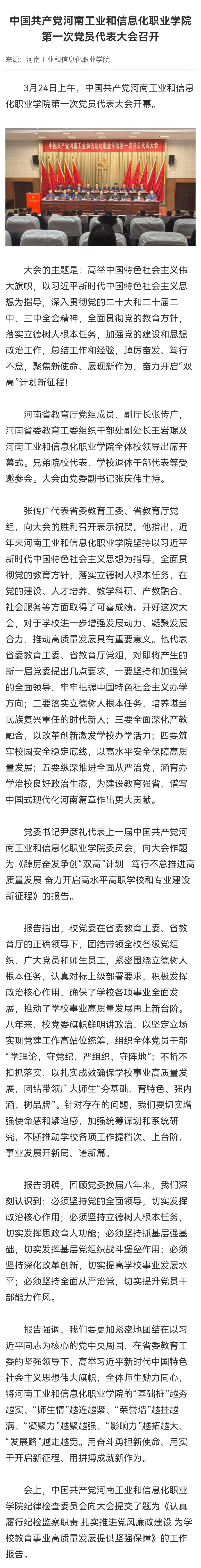 《顶端新闻 2025-3-25》报道中国共产党河南工业和信息化职业学院第一次党员代表大会召开