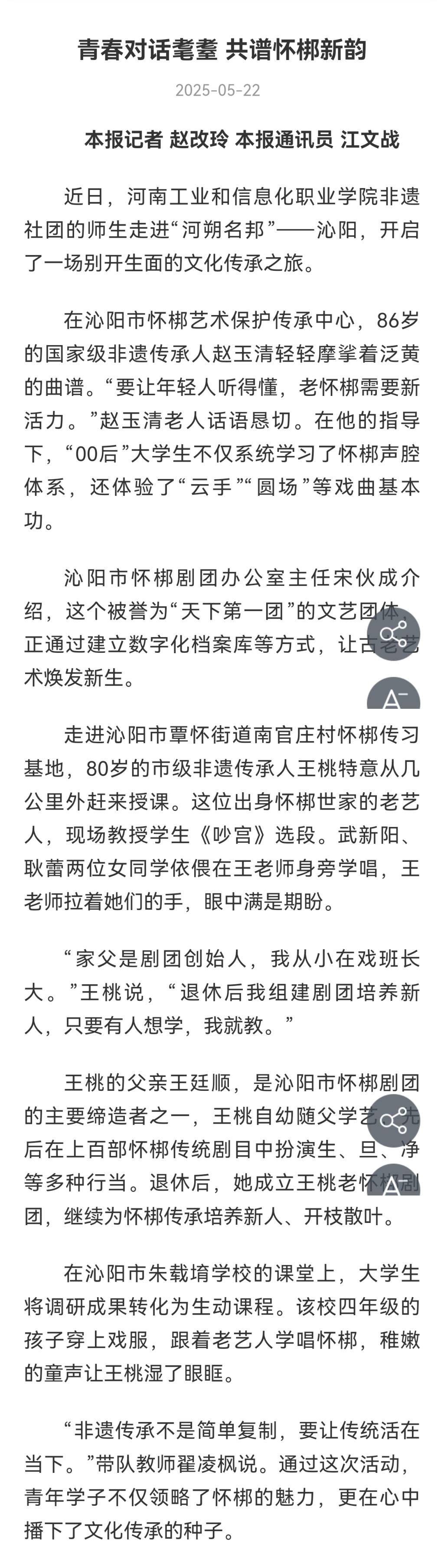 《焦作晚报 2025-5-22》报道我校青春对话耄耋 共谱怀梆新韵
