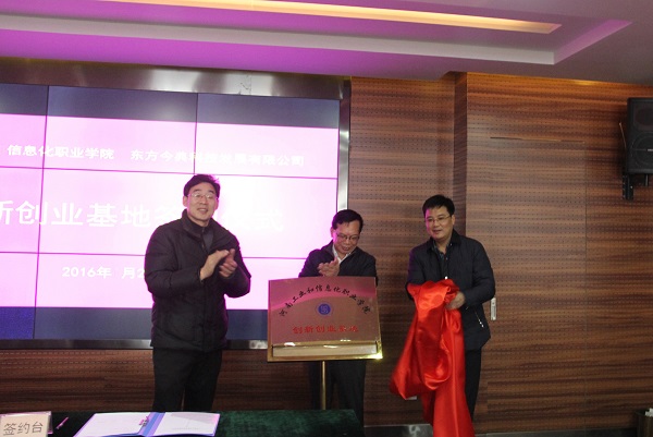 为积极响应李克强总理“大众创业、万众创新”的号召,扎实推进大学青年学生创新创业教育与实践活动,日前,我院与焦作东方今典科技发展有限公司校企共建大学生创新创业基地签约暨人才培养基地揭牌仪式在焦作科技总部新城创客空间隆重举行。焦作市城乡一体化示范区招商局局长高鸿,焦作科技总部新城项目总经理贾建军、副总经理涂哲,学院领导毋虎城、邱雨生出席揭牌仪式。