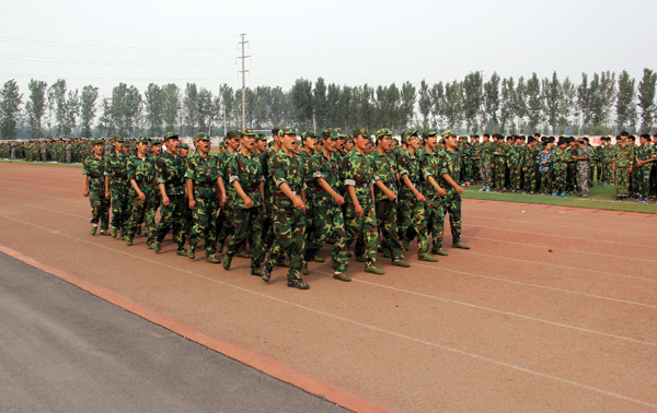 9月17日下午,我院2015级新生军训会操表演在田径运动场举行。院领导王海长、陈荣邦、席振修、邱雨生、学院相关处室和各系负责人、承训部队带队教官等观看了会操表演,并为受表彰的军训优秀教官和学生先进个人颁奖。王海长代表学院向承训部队赠送了锦旗。