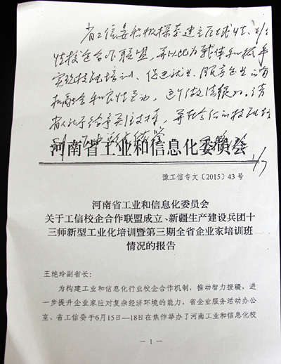 为构建工业和信息化行业校企合作新机制,推动智力援疆,进一步提升企业家应对复杂经济环境的能力,省工信委、省企业服务活动办公室于6月15日—18日在焦作举办了河南工业和信息化校企合作联盟成立大会、“双百”企业进焦作暨第三期企业家培训班,校企合作联盟成立大会暨第三期企业家培训班开班典礼于6月15日在我院成功举办。受省工信委委托,我院于6月8日—18日成功承办了新疆生产建设兵团十三师新型工业化培训班。上述活动得到了省委、省政府领导的充分肯定。省委书记郭庚茂、副省长王艳玲先后在省工信委呈报的“关于工信校企合作联盟成立、新疆生产建设兵团十三师新型工业化培训暨第三期全省企业家培训班情况的报告”上作出重要批示。