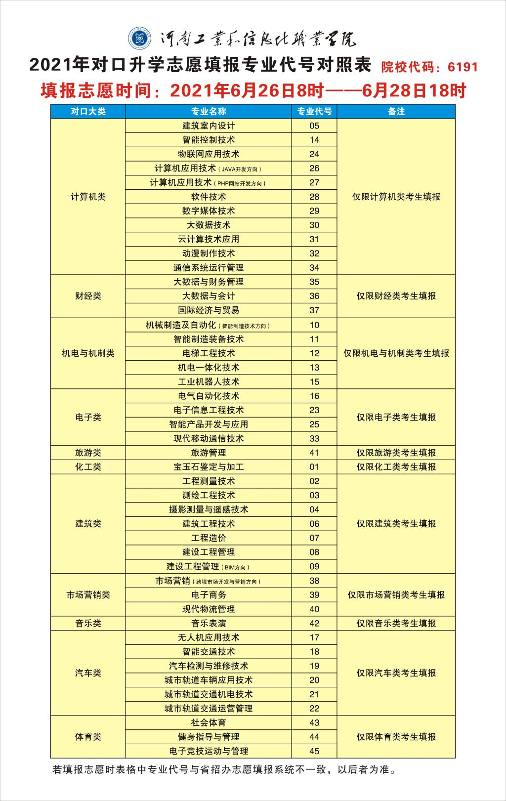 河南工业和信息化职业学院2021年对口专科志愿填报专业代号对照表