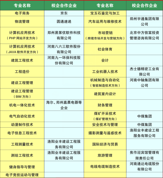 学院积极推进教学模式改革,深化“产教融合、校企合作”,先后与京东、郑州宇通、杰士德精密工业有限公司、洛阳业丰建设工程服务有限公司、赛菲尔(国际)珠宝集团、北京中方信富投资管理咨询有限公司、河南佰利联化学股份有限公司、河南八六三软件股份有限公司、东软睿道有限公司、河南影霜文化传媒有限公司、河南至正道一教育科技有限公司、深圳市明咨工程管理有限公司、河南方大建设工程管理股份有限公司和河南通达电缆股份有限公司等百余家知名企业签订校企合作协议,建立校企联合招生、联合培养、“双主体育人”的体制机制,实施产学一体、招生招工一体,学生入校即签订就业协议的现代学徒制、订单式培养,不断提升人才培养质量,服务区域经济的发展。近年来,学院学生在省级以上职业技能大赛中,先后获得第六届全国信息技术大赛最佳组织奖1项和个人二等奖2项、中国青年APP大赛河南分赛区优秀组织奖和创意一等奖、第二届“中国创翼”青年创新创业大赛“金翼奖”、第二届全国建设类院校施工技术应用技能大赛总冠军等众多荣誉。